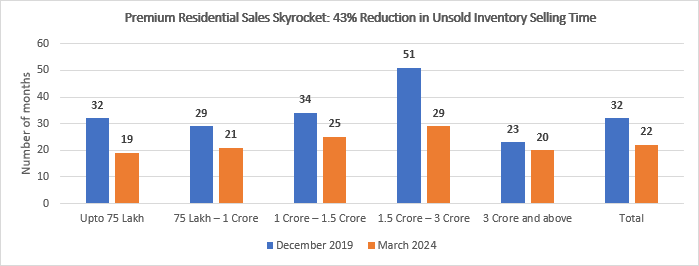 प्रीमियम सेगमेंट यानी 1.5 से 3 करोड़ रुपये कीमत वाले बिका बिके मकानों को बेचने में 2019 अंत तक 51 महीने का समय लग रहा था, जो 2024 की पहली तिमाही तक 43 फीसदी घटकर 29 महीने रह गया है।