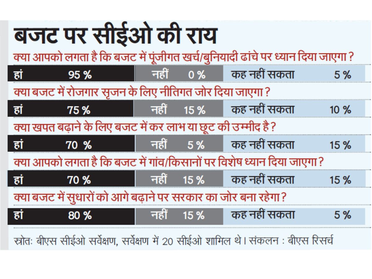 बिज़नेस स्टैंडर्ड सर्वेक्षण में सीईओ ने जताई उम्मीद; बजट में व्यय, रोजगार पर जोर, CEOs expressed hope in Business Standard survey; Emphasis on expenditure, employment in the budget