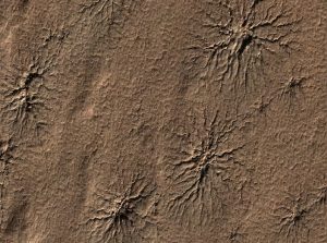 इन भू-आकृतियों को ‘अरैनीफॉर्म टेरेन’ कहा जाता है और इन्हें ‘मंगल की मकड़ियां’ नाम दिया गया है। ये संरचनाएं दरारों जैसी होती हैं और इनमें सैकड़ों रेखाएं होती हैं। ये ढांचे 3,300 फीट (1,000 मीटर) तक फैल सकते हैं और अंतरिक्ष से देखने पर ऐसा लगता है मानो सैकड़ों मकड़ियां मंगल की सतह पर दौड़ रही हों।