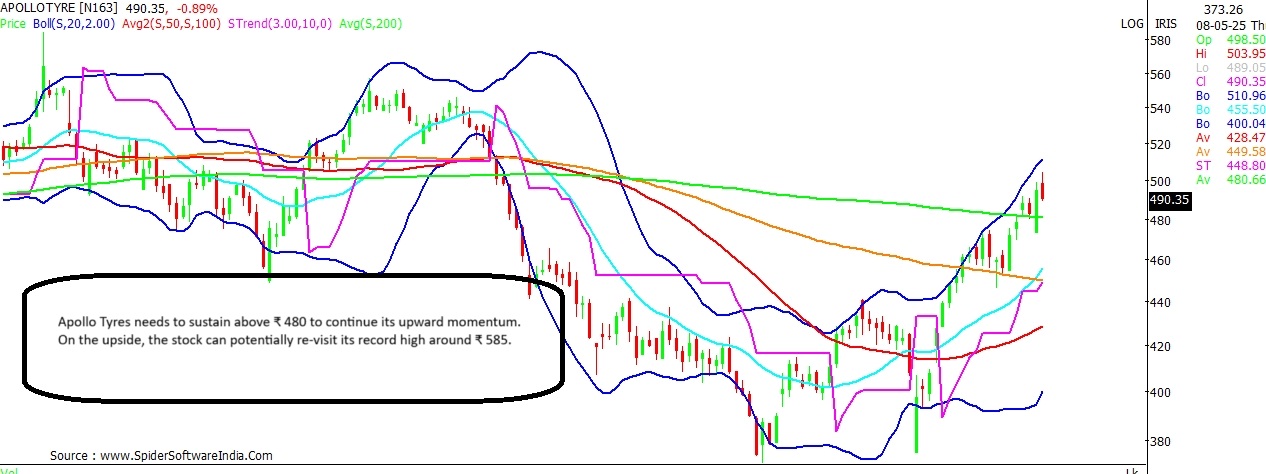 अपोलो टायर्स के शेयर हाल ही में अपने 200-दिन के मूविंग एवरेज (200-DMA) से ऊपर गए हैं। अब यह ₹481 से ऊपर रहने की कोशिश कर रहे हैं। अगर यह ₹481 से ऊपर रहते हैं, तो इसके ₹585 तक जाने की उम्मीद है। इसके रास्ते में ₹520, ₹548 और ₹557 के लेवलों पर रेजिस्टेंस हो सकता है। CLICK HERE FOR THE CHART