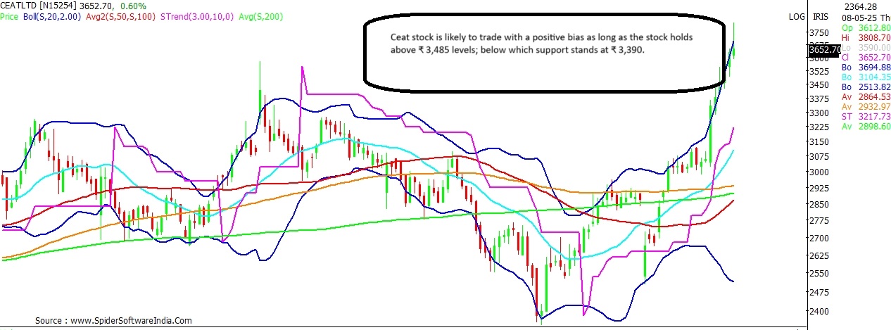 सीएट के शेयरों ने हाल ही में 24 प्रतिशत की बढ़त की है। अगर शेयर ₹3,485 से ऊपर रहते हैं, तो यह ₹4,080 तक जा सकते हैं। इसके रास्ते में ₹3,755 और ₹3,917 के लेवलों पर रेजिस्टेंस हो सकता है। CLICK HERE FOR THE CHART