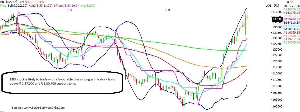 एमआरएफ के शेयरों का हाल अच्छा है, बशर्ते यह ₹1,37,000 से ऊपर बने रहें। इसके नीचे ₹1,30,700 के लेवल पर सपोर्ट मिल सकता है। ऊपर की ओर, ₹1,50,000 के लेवल पर रेजिस्टेंस हो सकता है, और इसके बाद ₹1,57,700 तक जा सकते हैं। CLICK HERE FOR THE CHART
