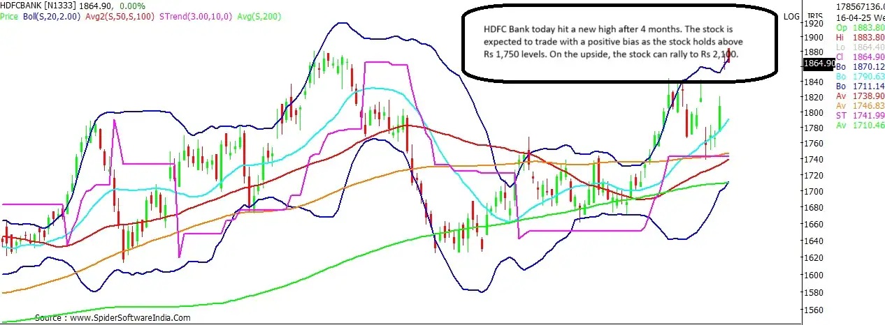 एचडीएफसी बैंक के शॉर्ट टर्म में पॉजिटिव रुझान के साथ कारोबार करने की संभावना है। विशेष कर तब तक जब तक कि स्टॉक ₹ 1,800 के स्तर से ऊपर रहता है। इससे नीचे स्टॉक के लिए समर्थन ₹ 1,750 के लेवलपर 50-दिवसीय डेली मूविंग औसत (50-डीएमए) के आसपास मौजूद है।