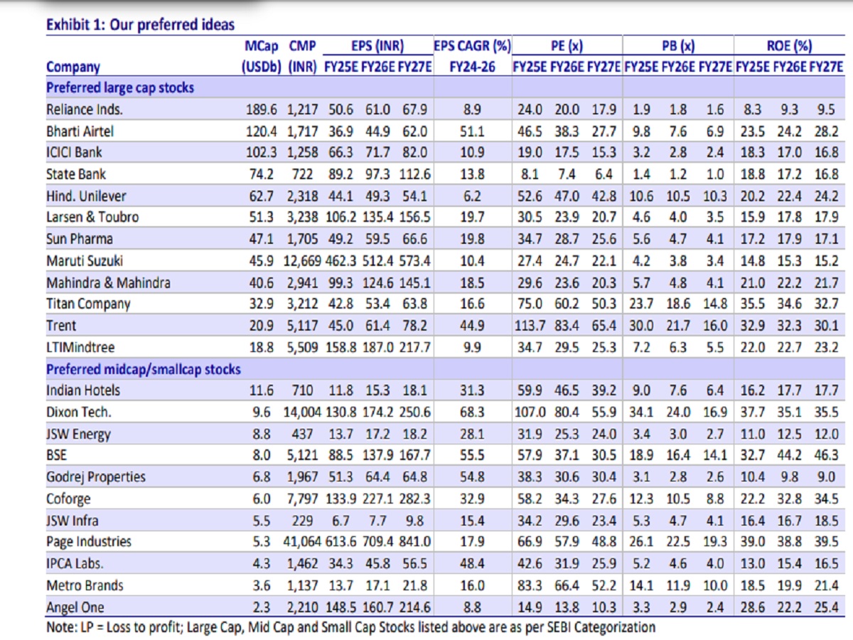 ब्रोकरेज ने निवेश के लिहाज से अपने पसंदीदा स्टॉक्स बताए है। इनमें लार्ज कैप स्टॉक्स के रूप में रिलायंसइंडस्ट्रीज, भारती एयरटेल, आईसीआईसीआई बैंक, एसबीआई, हिंदुस्तान यूनिलीवर जैसे स्टॉक्स शामिल हैं। वहीं, मिडकैप स्टॉक्स में इंडियन होटल्स, डिक्शन टेक्नोलॉजीस और जेएसडब्ल्यू एनर्जी जैसे स्टॉक रिकमेंड किए हैं।