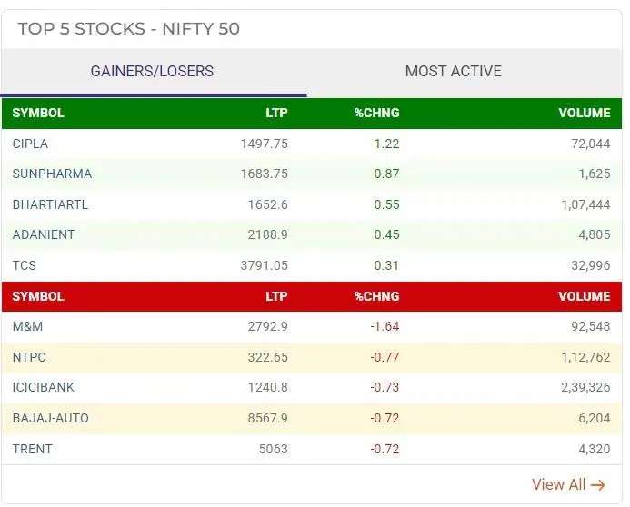 शेयर बाजार में उतार-चढ़ाव जारी है। निफ्टी 50 में महिंद्रा एंड महिंद्रा (M&M), एनटीपीसी और आईसीआईसीआई बैंक को नुकसान हुआ और ये टॉप लूजर्स में शामिल रहे। वहीं, सिप्ला, सन फार्मा और भारती एयरटेल टॉप गेनर्स के रूप में उभरे।
