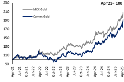 एक्सिस सिक्युरिटीज (Axis Securities) के सीनियर रिसर्च एनॉलिस्ट (कमोडिटीज) देवेया गगलानी कहते हैं, पिछले तीन वर्षों में एमसीएक्स (MCX) पर सोने के भाव में जोरदार उछाल देखने को मिला है। इससे निवेशकों को डबल-डिजिट रिटर्न मिला। साल 2025 के पहले चार महीने सोने के निवेशकों के लिए बीते एक दशक में सबसे बेहतरीन शुरुआत में से एक रहे हैं। सोने की कीमतों में इस साल अब तक करीब 25 फीसदी की जोरदार तेजी आई है।